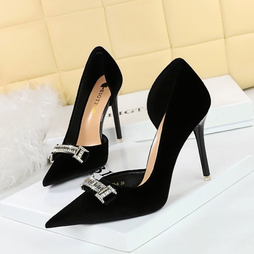 Bigtree Shoes 1363-K80 European and American Style High Heels Stiletto Heel Women’s Shoes Thickened Suede Shallow Mouth Pointed Toe Side Hollow Rhinestone Buckle Single-Layer Shoes