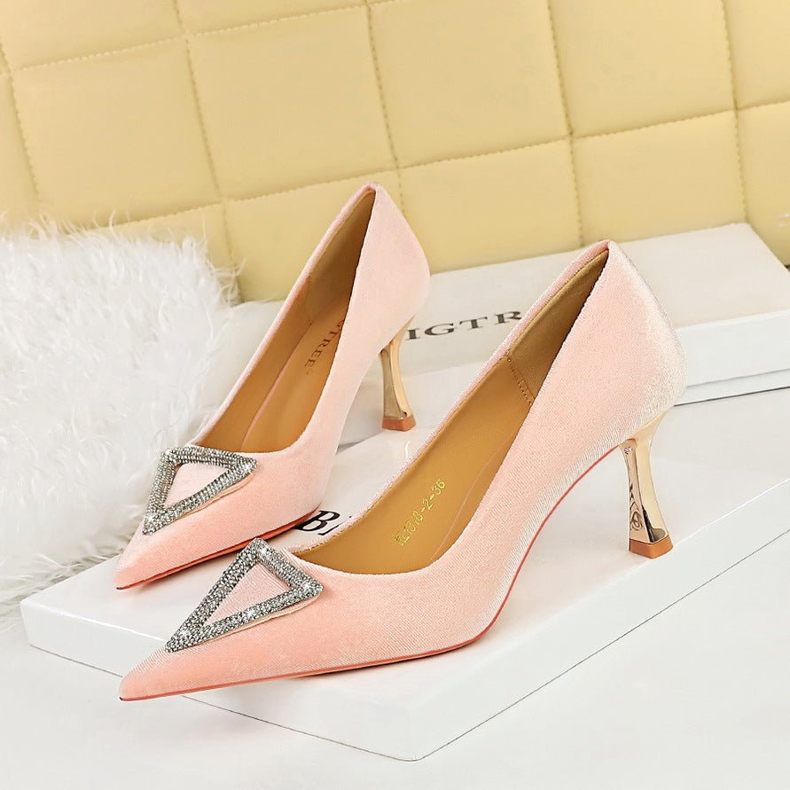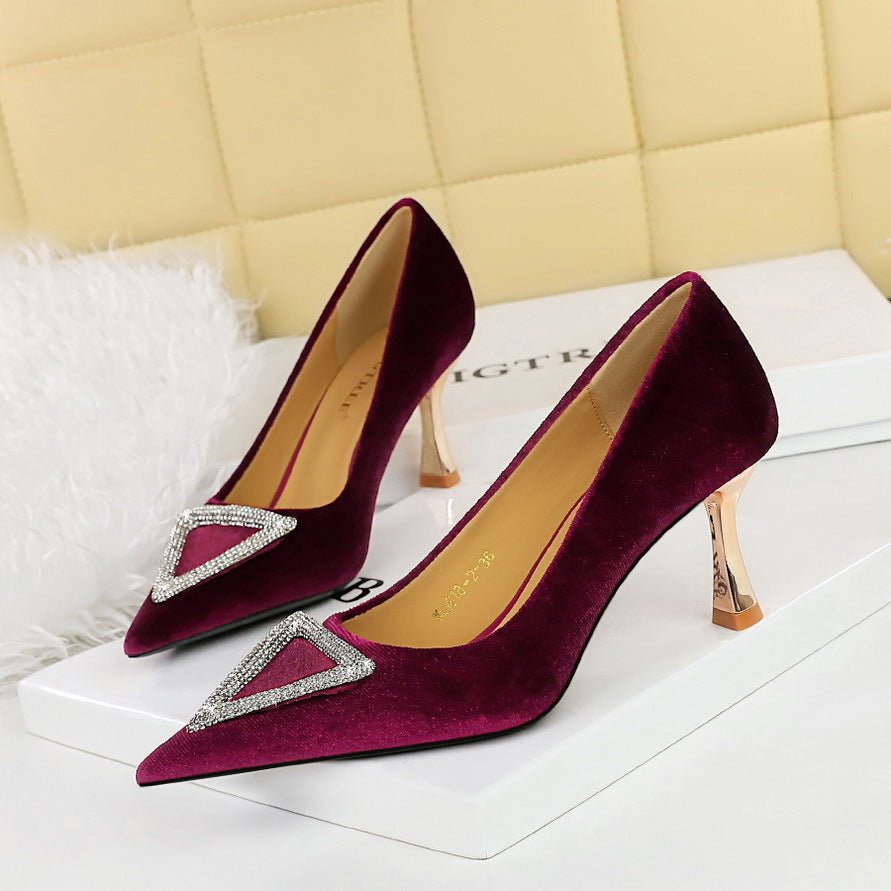 Popular Elements: European and American Style Fashion Banquet Metal Heel Wine Glass Heel Thick Suede Triangle Metal Rhinestone Buckle