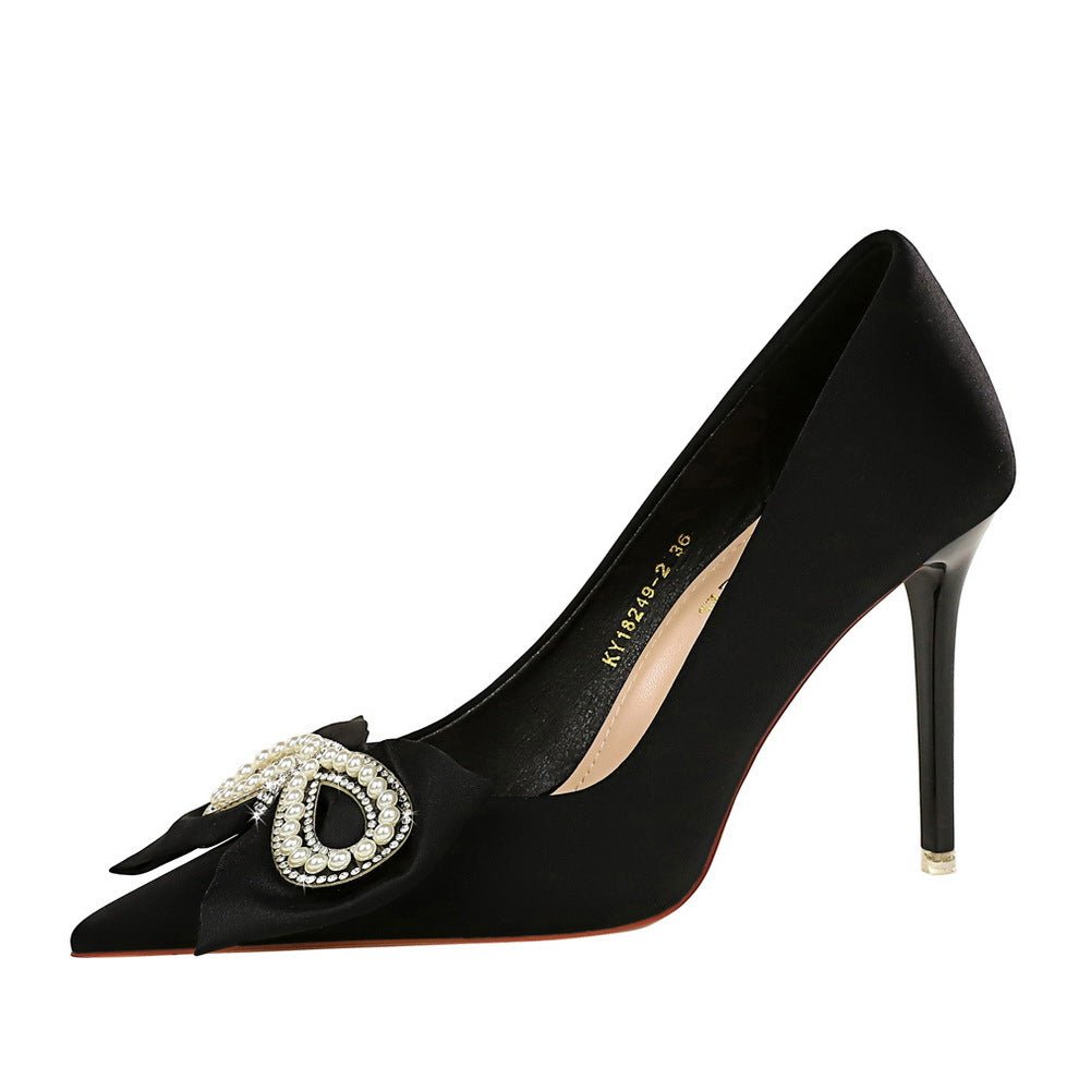BIGTREE SHOES 18249-H28 Korean Style Banquet High Heels Stiletto Heel Shallow Mouth Pointed Satin Pearl Rhinestone Bow Single-Layer Shoes for Women