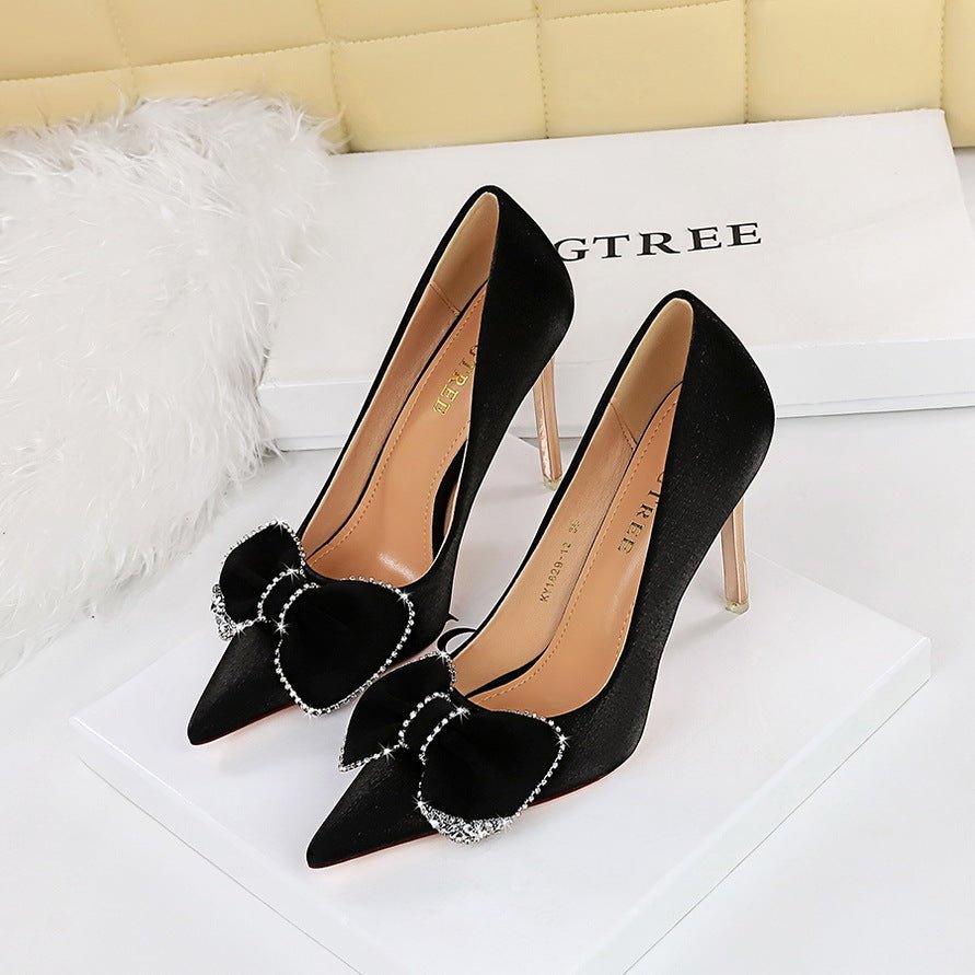 BIGTREE SHOES 1829-H31 European and American Banquet High Heels Women’s Shoes Metal Heel Super High Heel Pointed Toe Satin Rhinestone Bow Pumps