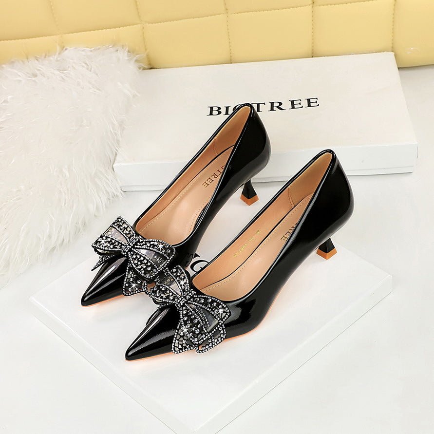 BIGTREE SHOES 1961-H39 European and American Banquet Women’s Shoes Small Stiletto Heel Mid Heel Patent Leather Shallow Mouth Pointed Toe Rhinestone Bow Pumps Women’s Shoes