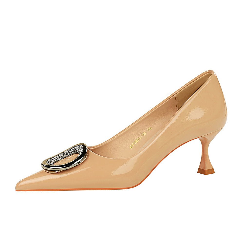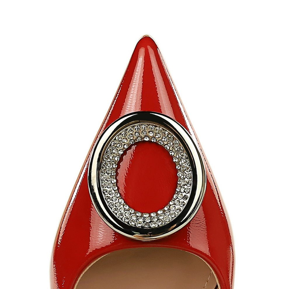 BIGTREE SHOES 1961-K61 European and American Style Banquet Fashion Women’s Shoes Patent Leather Low-Cut Pointed-Toe Metal Rhinestone Buckle Pumps Women’s High Heels