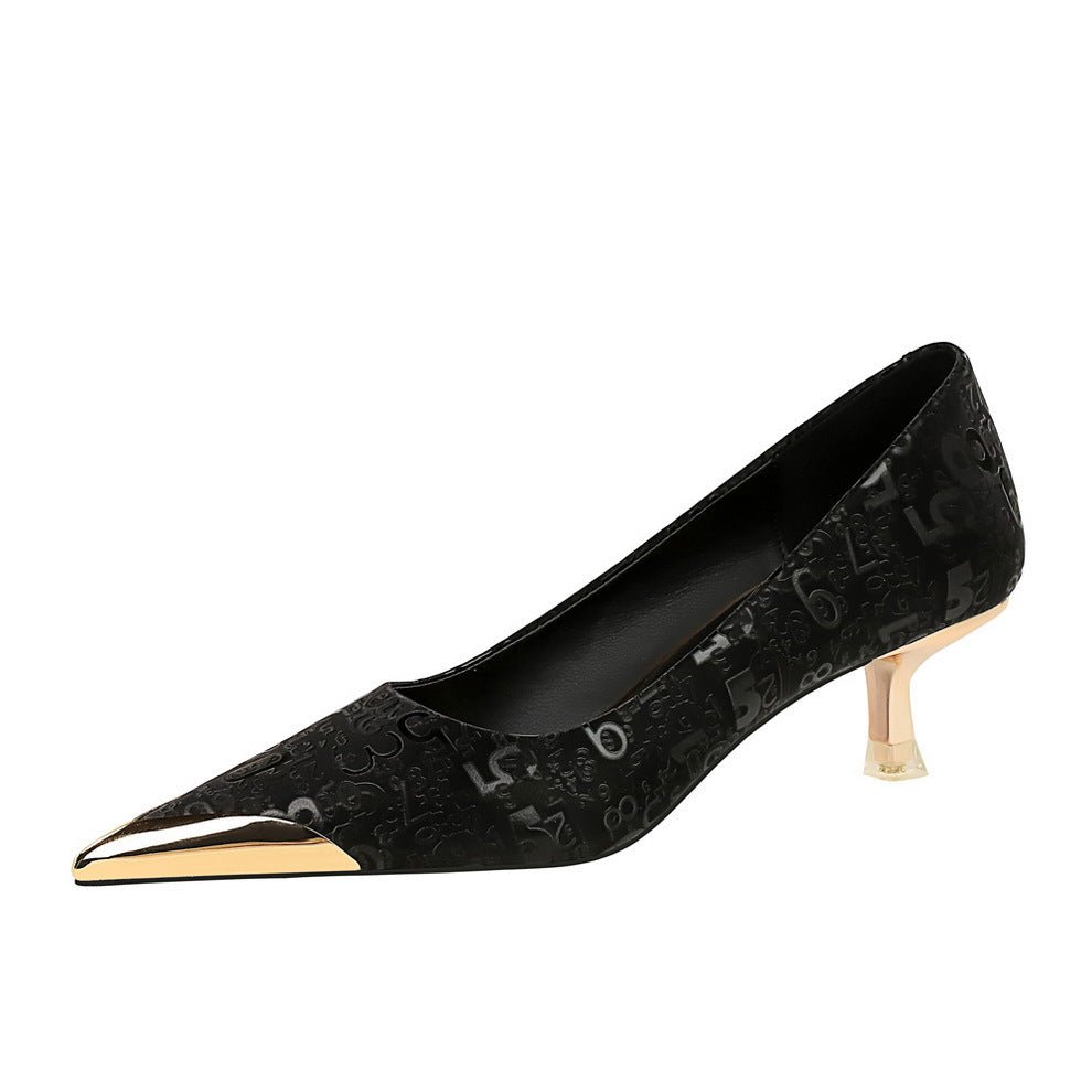 BIGTREE SHOES 237-28 European and American style banquet middle heel shallow mouth metal pointed graffiti pattern slim women’s shoes spring and autumn shoes