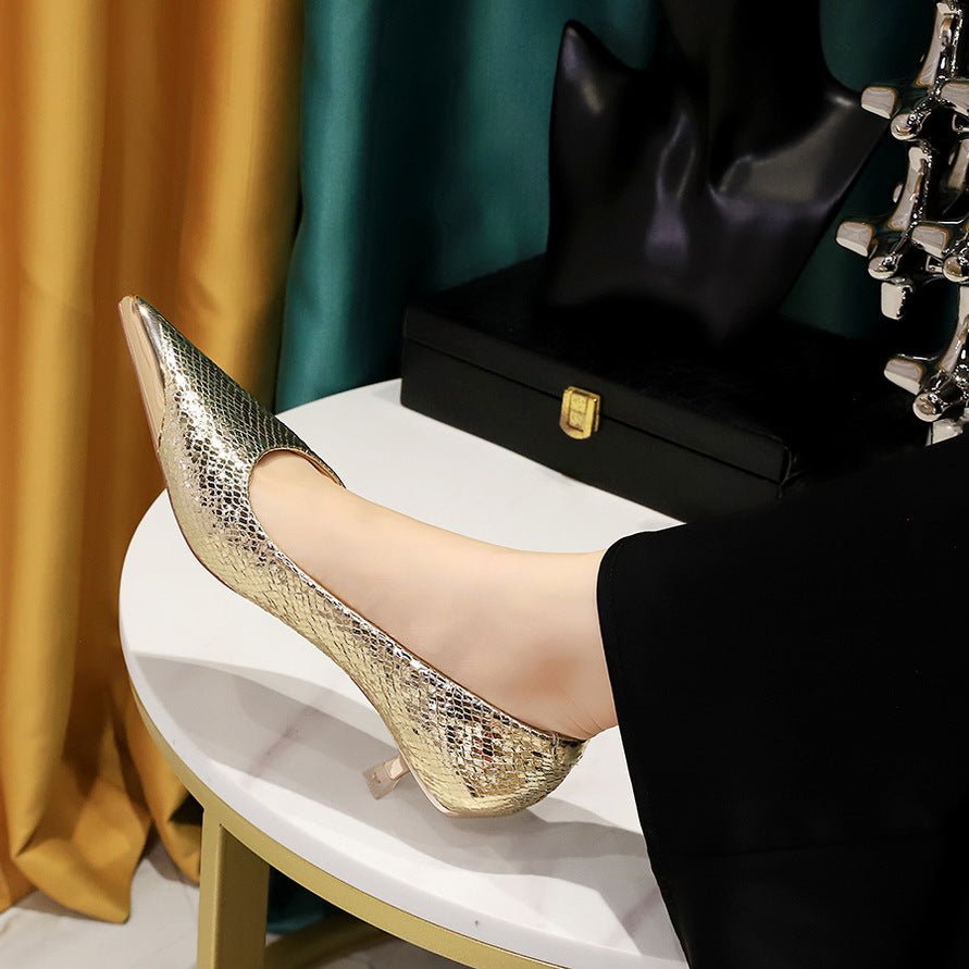 BIGTREE SHOES 237-29 European and American Style Banquet Women’s Shoes Mid-Heel Low-Cut Metal Pointed Shining Sequin Cloth Snake Pattern Pumps Women’s Shoes