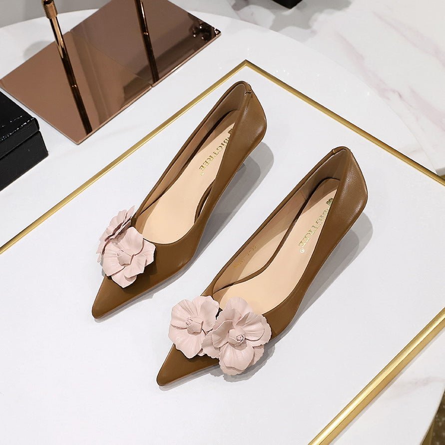 Popular Elements: Korean Style Fashionable Banquet Delicate Slimming Spring and Autumn Sweet Mid Heel Versatile Color Matching Flowers
