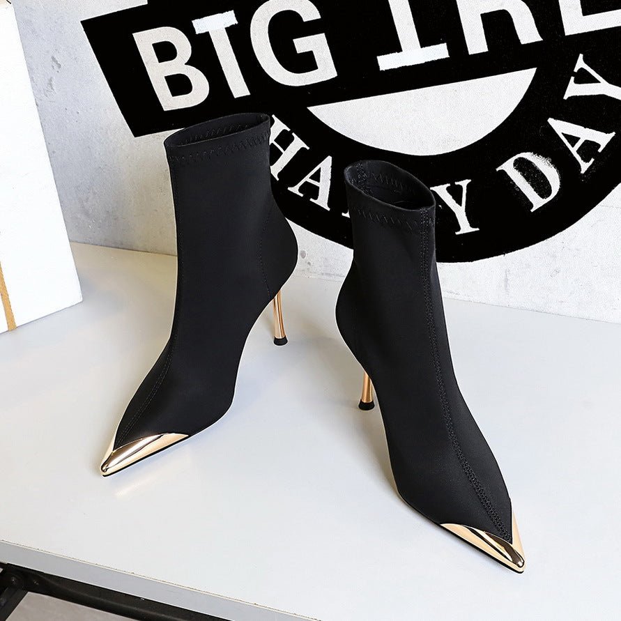 Bigtree Shoes 319-13 European and American Style Fashion Banquet Women’s Short Boots Stiletto Heel Elastic Lycra Metal Pointed Ankle Boots