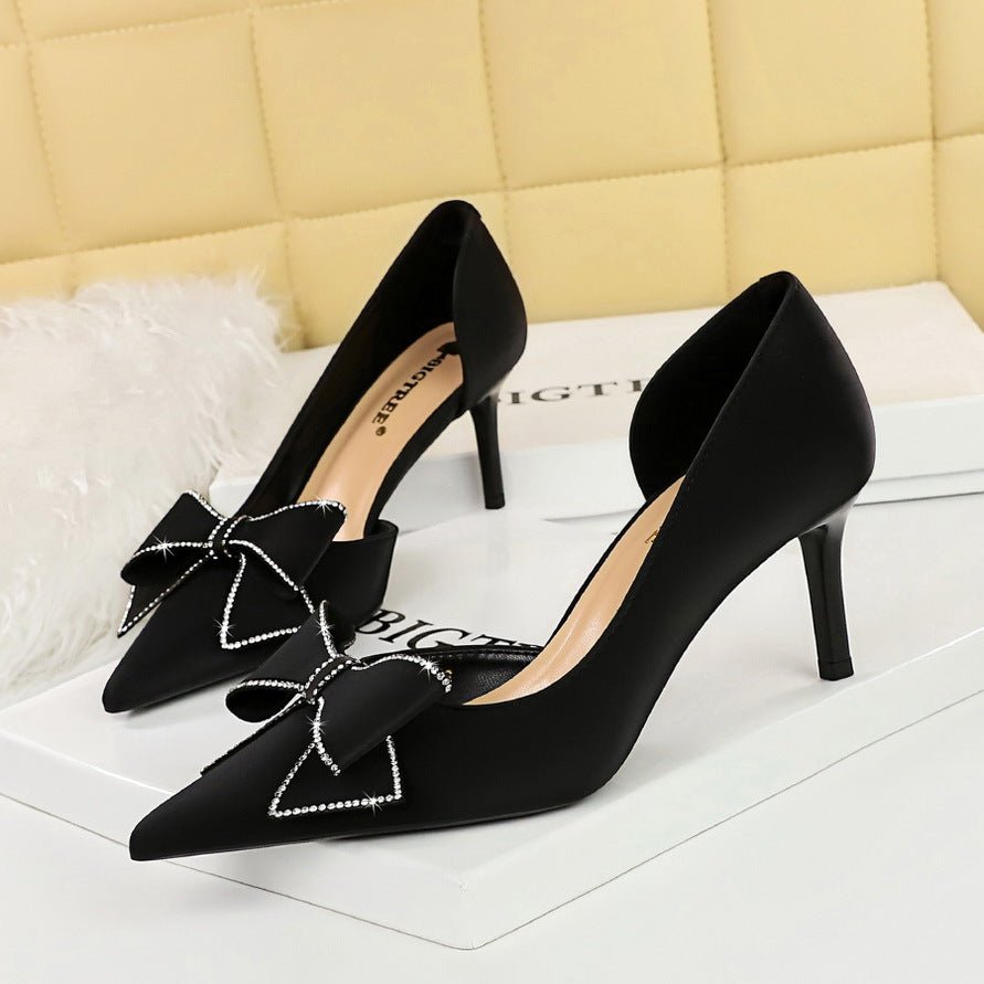 BIGTREE SHOES 3226-Ah37 Korean Style Women’s Shoes Wedding Shoes Stiletto Heel Shallow Mouth Pointed Toe Side Hollow Rhinestone Bow Pumps