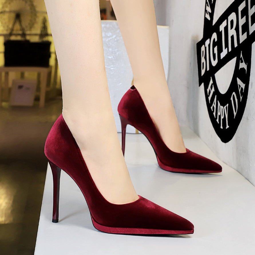 BIGTREE SHOES 3255-10 European and American Banquet Super High Heel Waterproof Platform Women’s Shoes Thin Heel Shallow Mouth Pointed Toe Thickened Suede Single Shoes