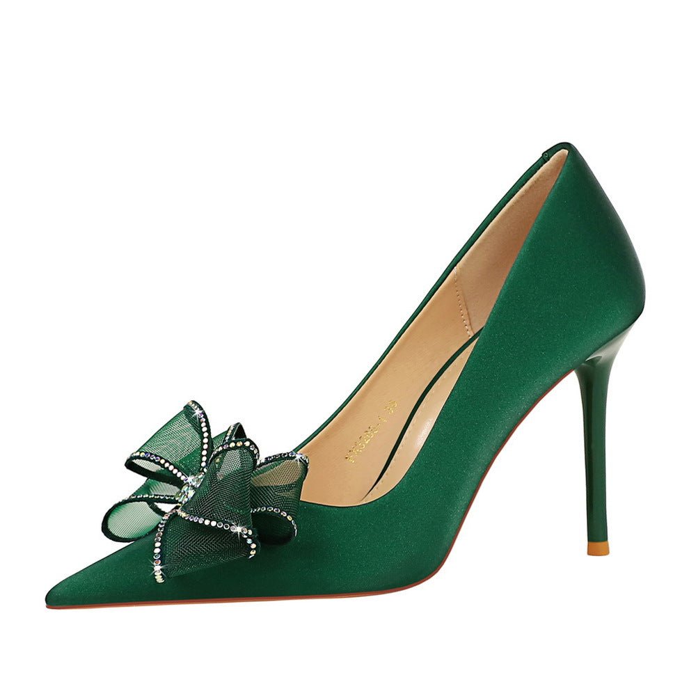 Popular Elements: European and American Style Fashionable Light Luxury Banquet High Heels Super High Heel Mesh Lace Bow Rhinestone Bow