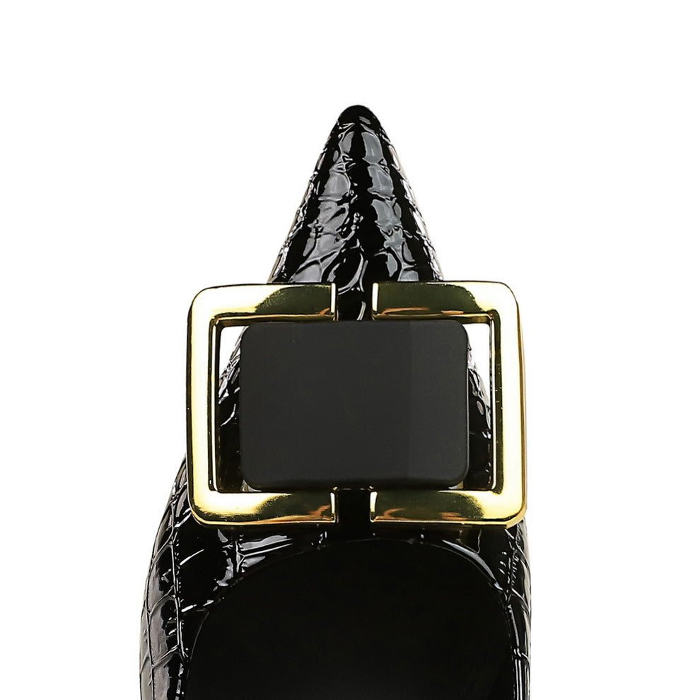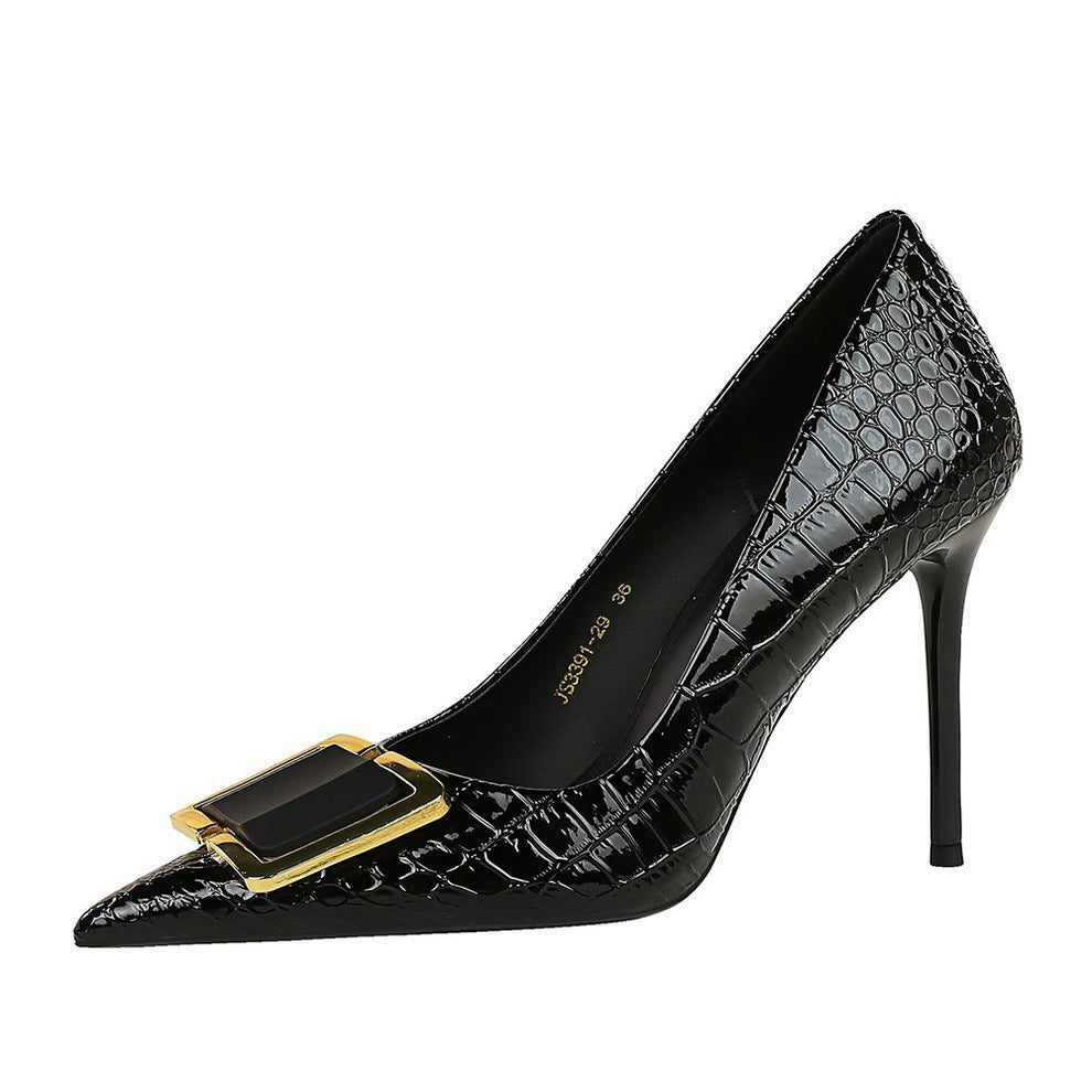 BIGTREE SHOES 3391-K57 European and American Style High Heels Women’s Shoes Stiletto Heel Vintage Stone Pattern Patent Leather Pointed Belt Buckle Decoration Pumps