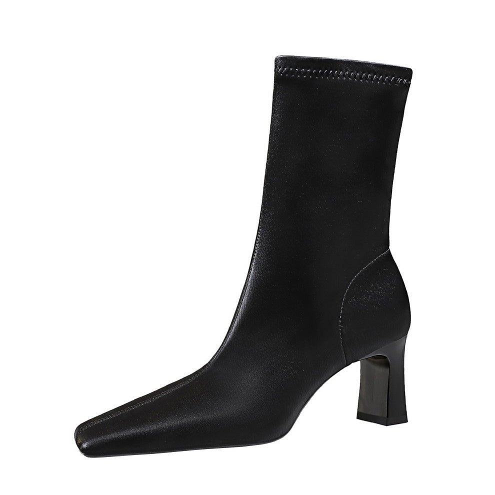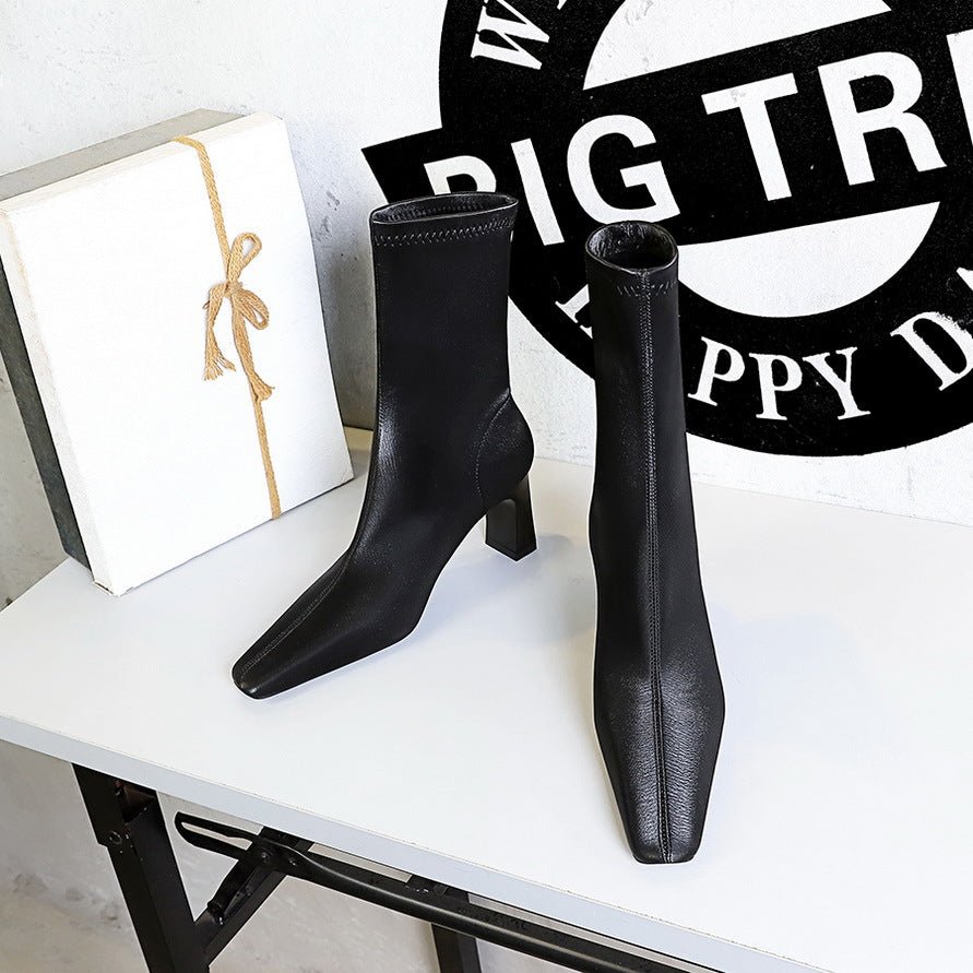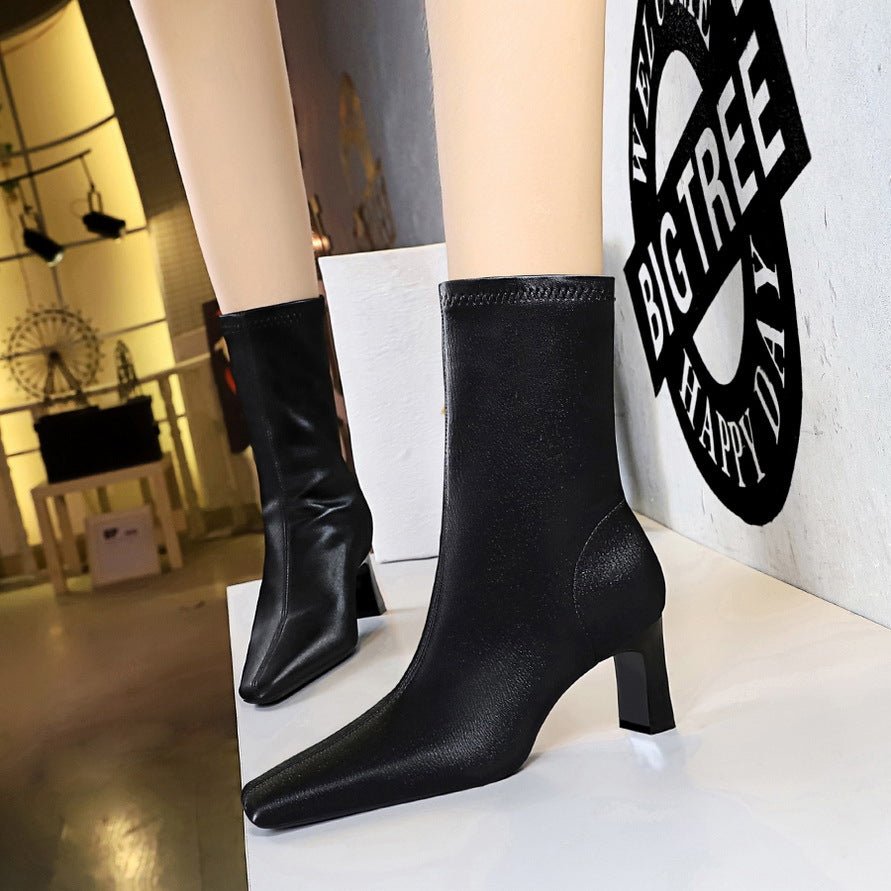 BIGTREE SHOES 375-5 Retro European American Style Simple and Thin Women’s Short Boots Skinny Boots Chunky Heel High Heel Square Head Winter Boots