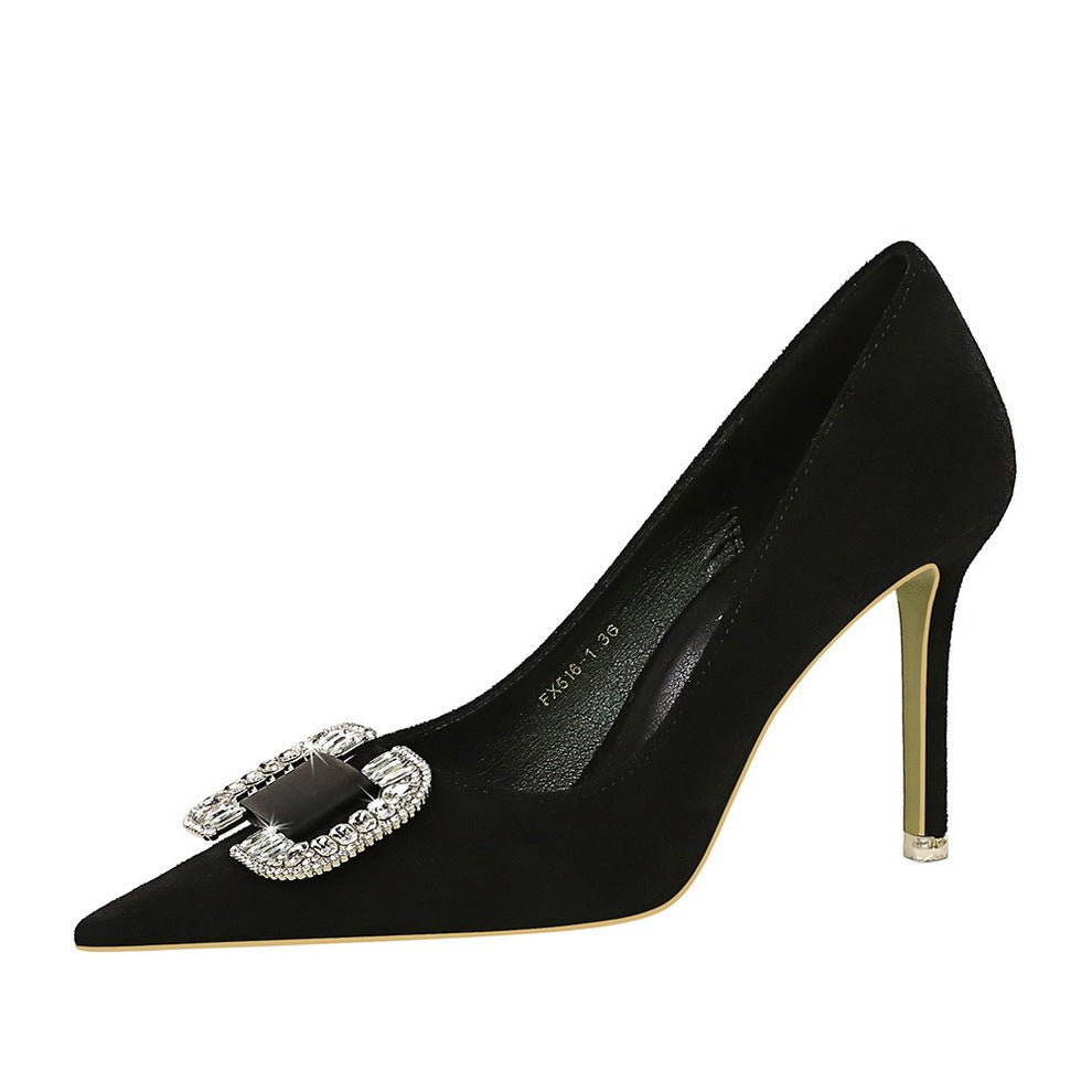 Bigtree Shoes 516-k69 European and American Fashion Banquet High Heels Women’s Shoes Stiletto Suede Shallow Mouth Pointed Toe Rhinestone Buckle High Heel Pumps