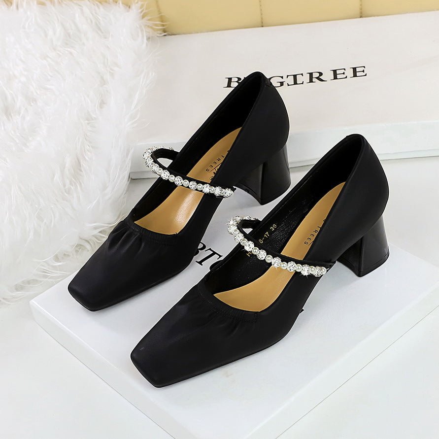 BIGTREE SHOES 5288-17 Retro Korean Type Women’s Chunky Heel Mid Heel Shoes Low-Cut Square Toe Pearl Rhinestone Strap Mary Jane Shoes