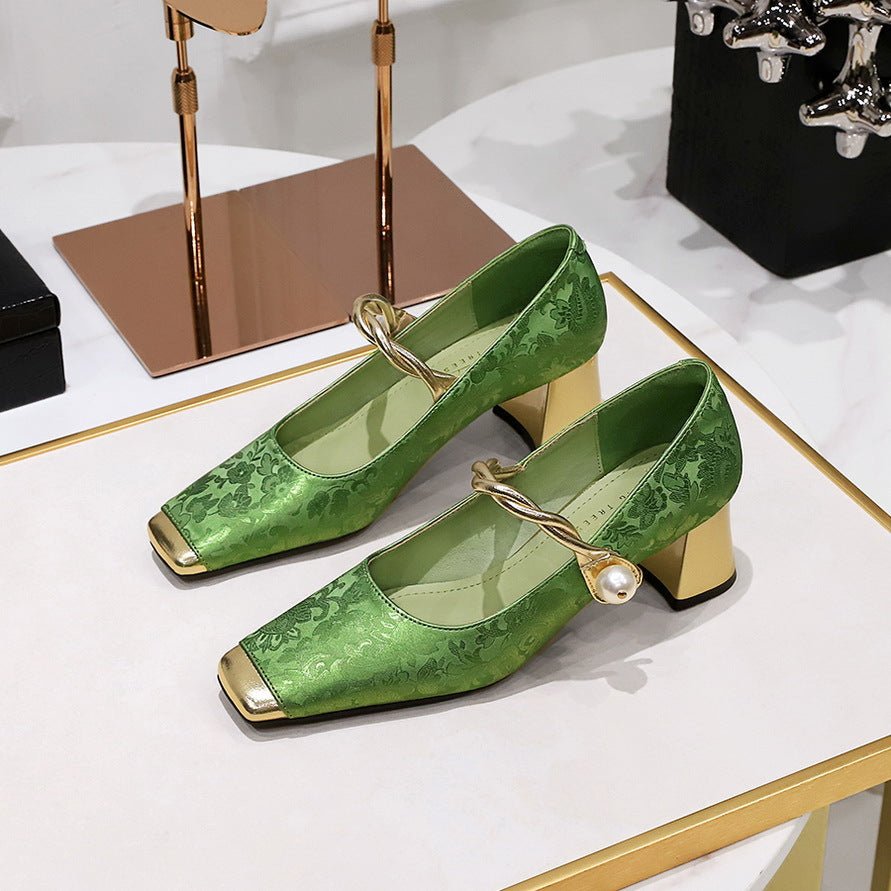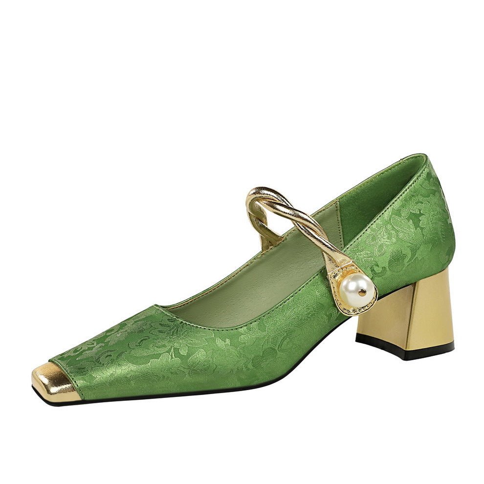 BIGTREE SHOES 5288-6 National Style Women’s Shoes Banquet Chunky Heel Mid Heel Satin Embroidered Color Matching Square Toe Low-Cut Pearl Ankle-Strap Shoes
