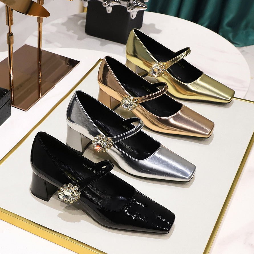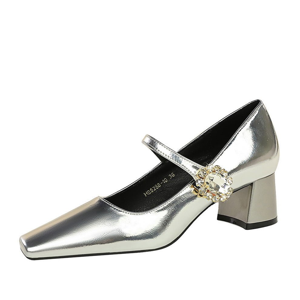 BIGTREE SHOES 5288-K86 Retro European American Style Banquet Women’s Shoes Mid Heel Chunky Heel Low-Cut Square Head Rhinestone Buckle Ankle-Strap Shoes Female