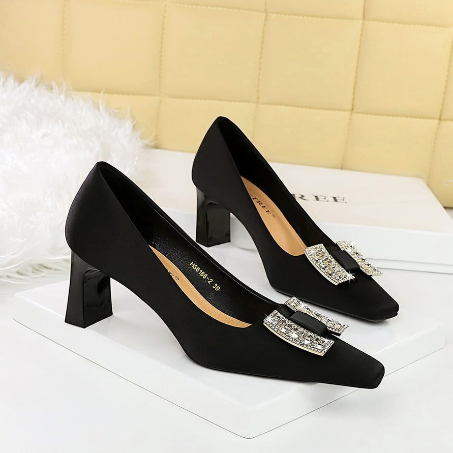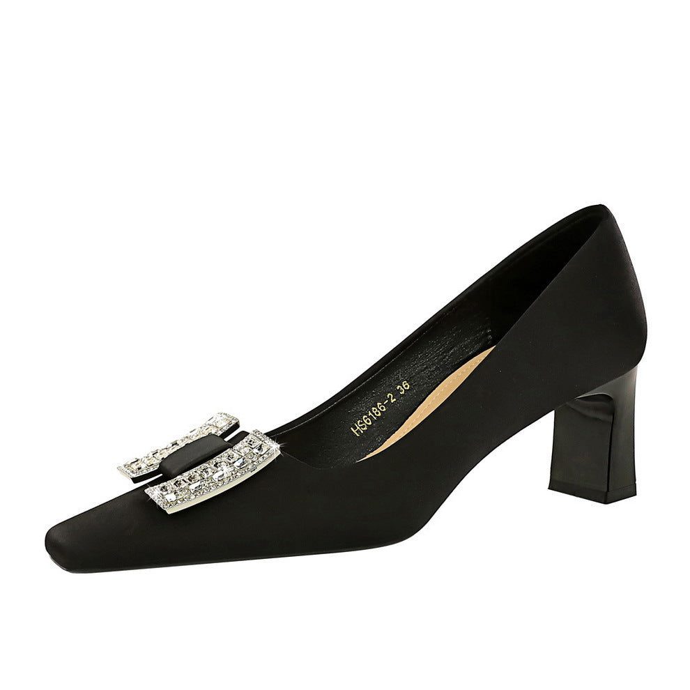 BIGTREE SHOES 6186-k70 European and American Style Banquet Light Luxury Women’s Shoes Chunky Heel High Heel Low-Cut Square Toe Satin Rhinestone Buckle Pumps Women’s Shoes