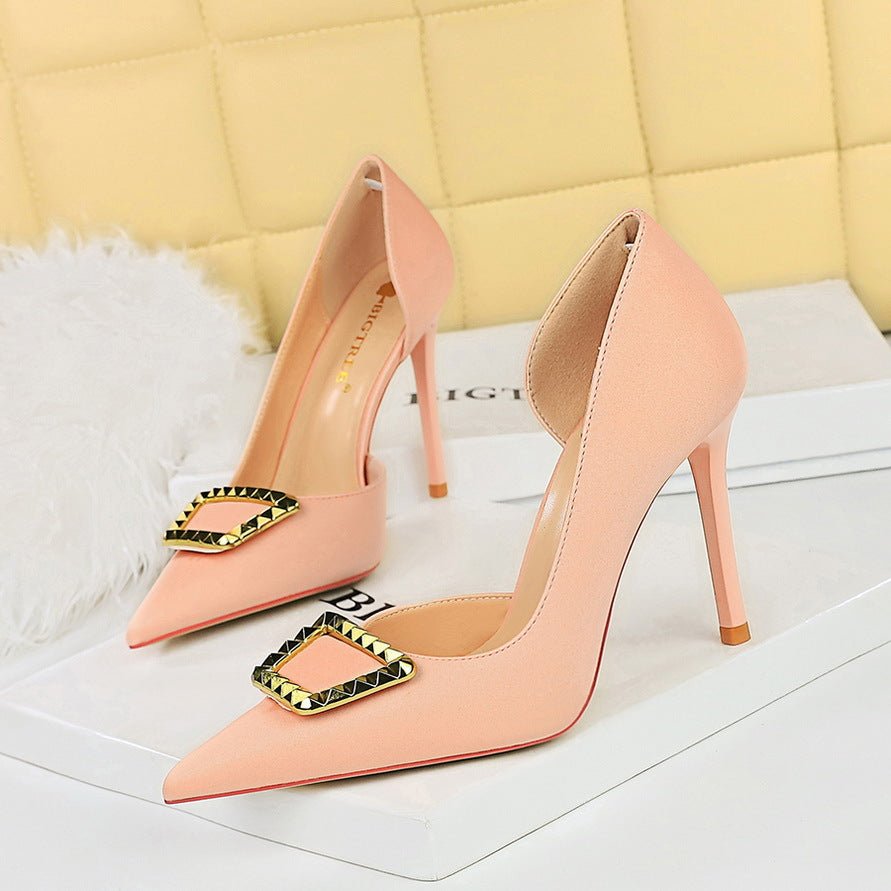 Bigtree Shoes 626-K9 European and American Style Nightclub High Heels Women’s Shoes Stiletto Low-Cut Pointed Side Hollow-out Metal Rivet Buckle Single-Layer Shoes Women