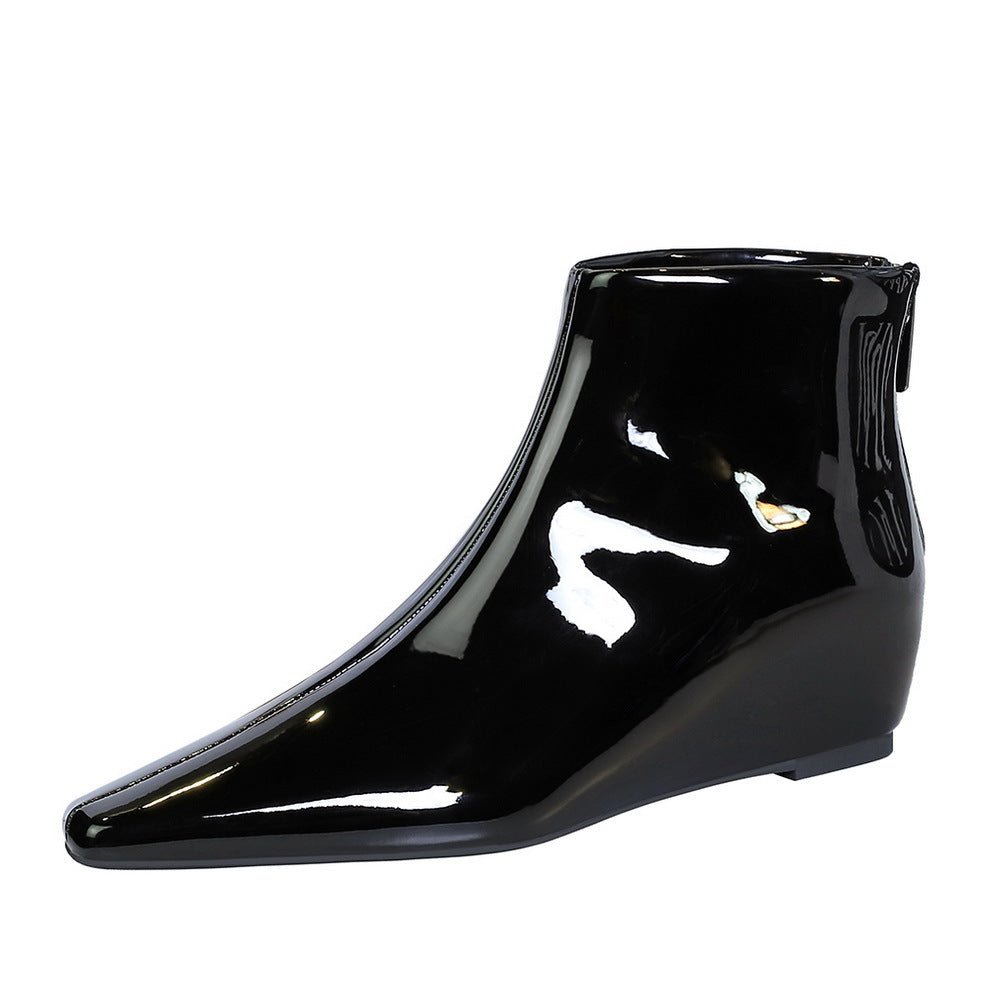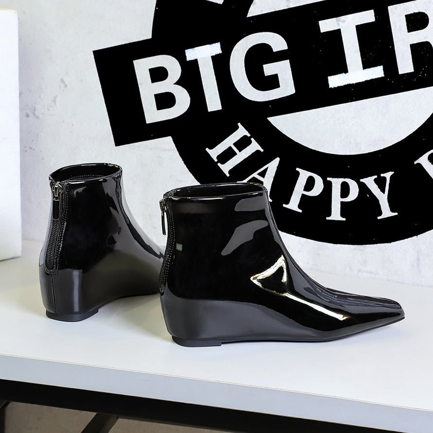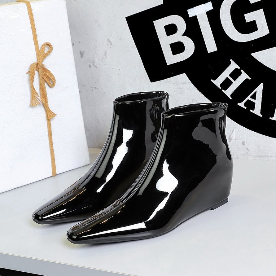 Bigtree Shoes 6632-1 Korean Style Fashion All-Match Height Increasing Insole Wedge Shiny Patent Leather Small Short Pedicure Women’s Skim-Fit Boots Ankle Boots