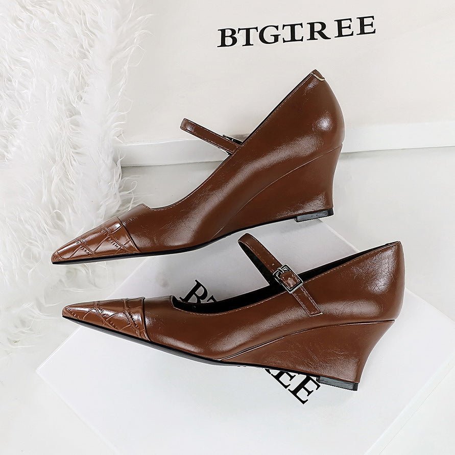 Popular Elements:Retro European and American Style Stitching Pointed Toe Strap Wedge Heels