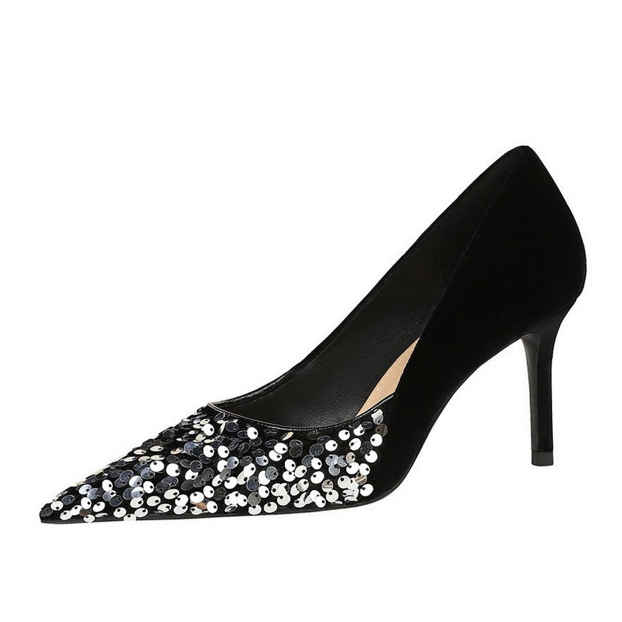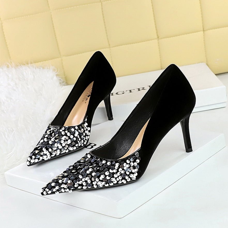BIGTREE SHOES 7236-1 European and American Style Affordable Luxury Fashion Banquet Women’s Shoes High Heels Stiletto Heel Shallow Mouth Pointed Stitching Sequin Cloth Pumps