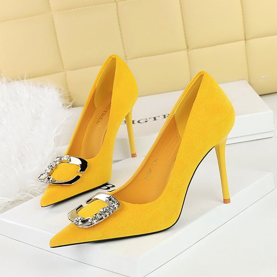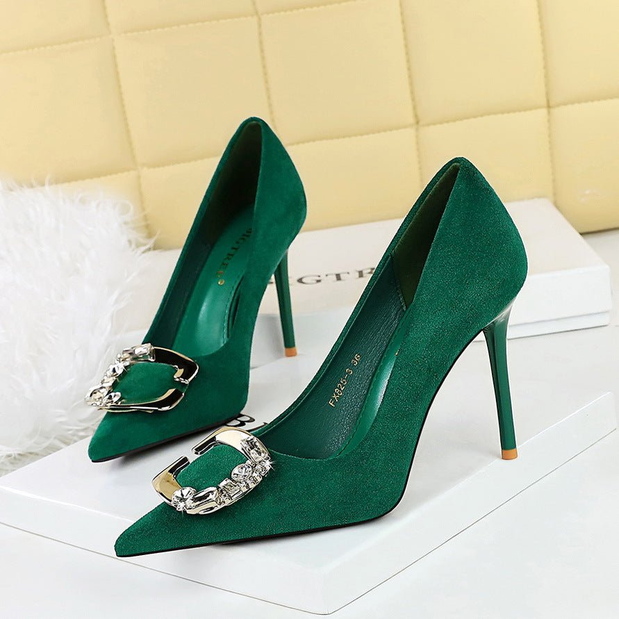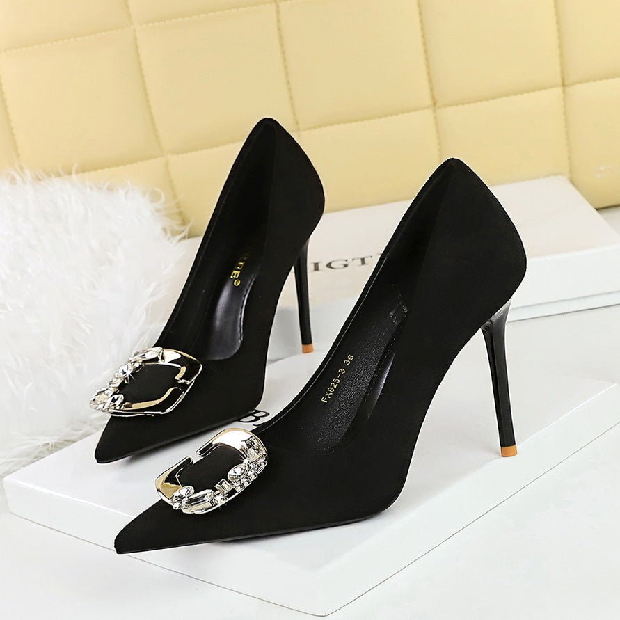 BIGTREE SHOES 825-K52 Banquet High Heels Women’s Shoes Stiletto Heel Shallow Mouth Pointed Toe Suede Metal Rhinestone Belt Buckle Pumps