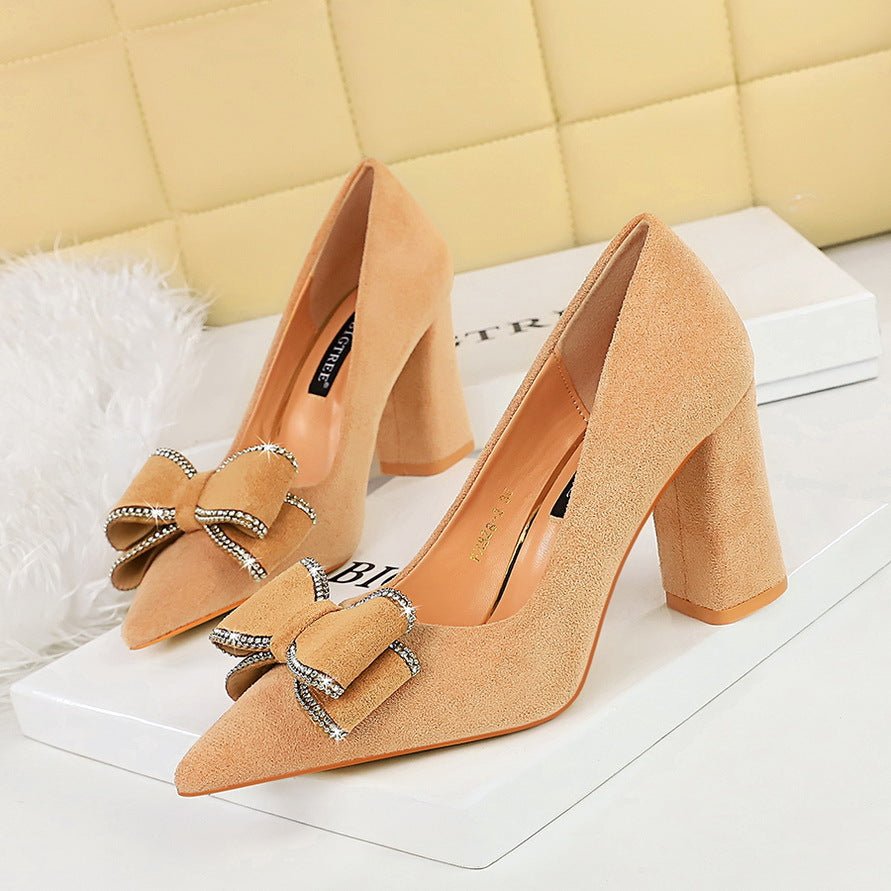 BIGTREE SHOES 828-H30 Korean Style Fashionable Spring and Autumn New High Heels Chunky Heel Suede Shallow Mouth Pointed Bow Single-Layer Shoes Women’s Shoes