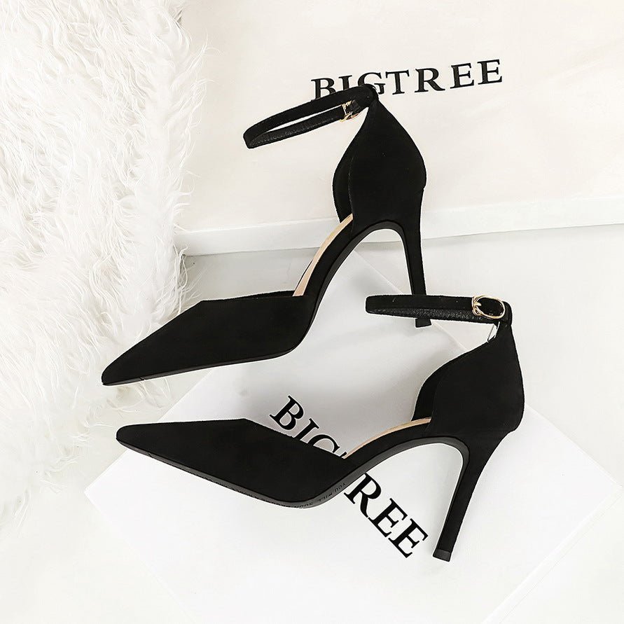 BIGTREE SHOES 8386-8 European and American Style Simple Hollow Women’s Shoes Stiletto Heel Shallow Mouth Pointed Toe Suede Hollow-out Strap Sandals