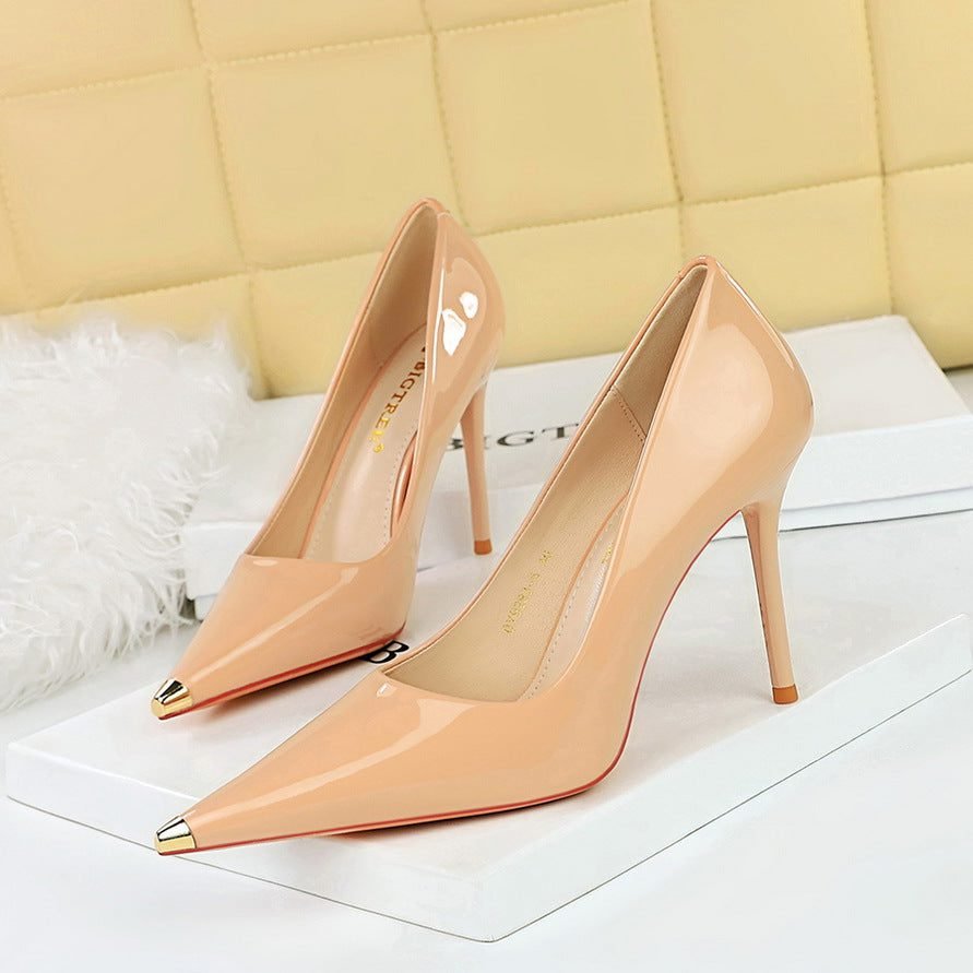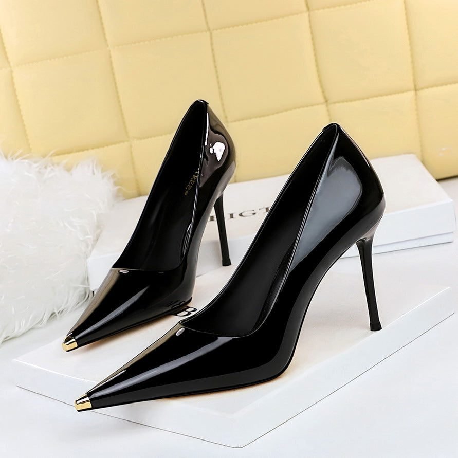 BIGTREE SHOES 9283-6 European and American Style Slimming High Heels Stiletto Heel Shiny Patent Leather Shallow Mouth Metal Pointed Toe Pumps