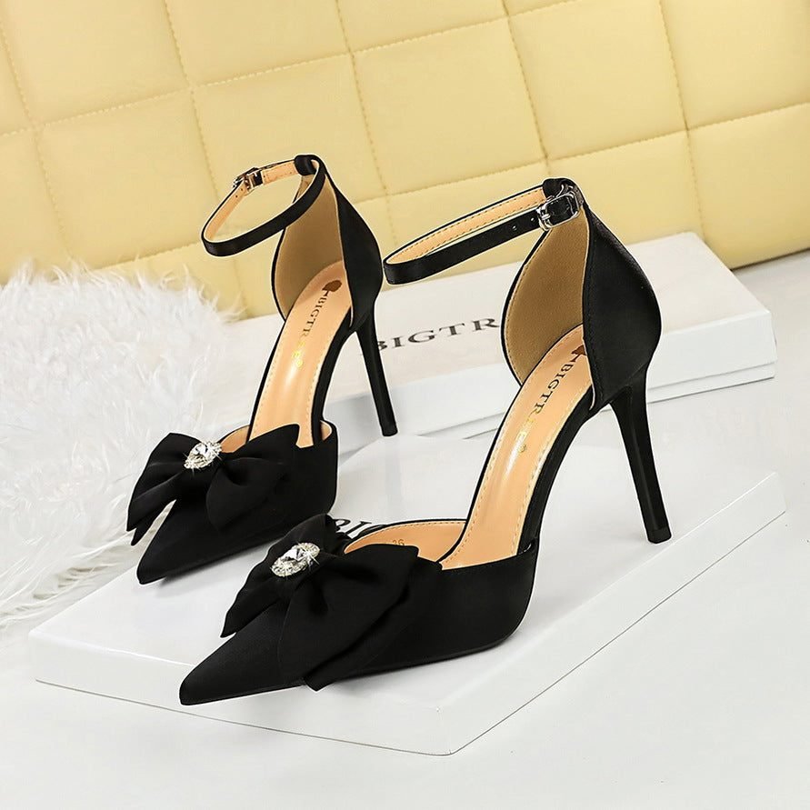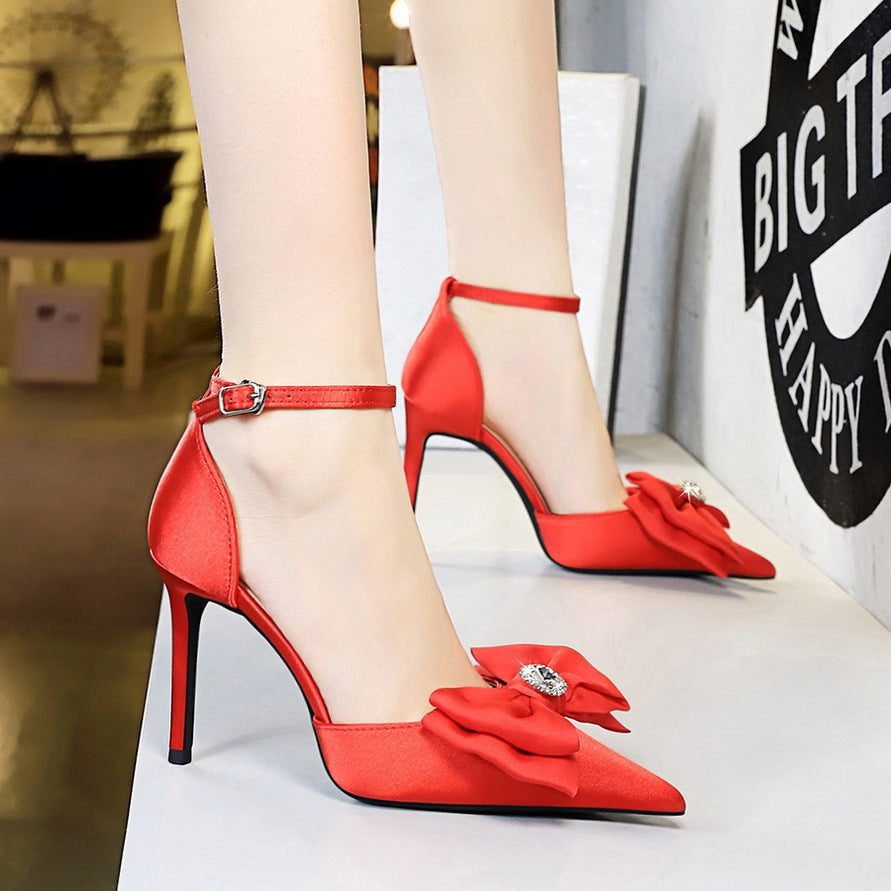 BIGTREE SHOES 9863-H33 European and American Style High Heels Women’s Shoes Shallow Mouth Pointed Hollow Satin Bow Strap High Heel Sandals